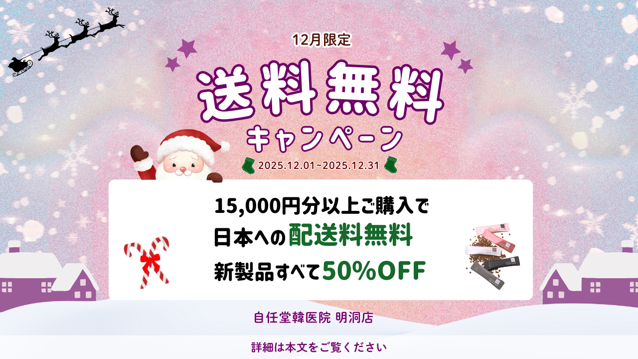 送料無料キャンペーン こんにちは、自任堂です。 12月のキャンペーンは15,000円以上のご購入で送料が無料に! さらに、新製品すべて50%OFF! さらに、 ・-・-・-・-・-・-・- ◆ 空肥丸1か月分ご購入で送料無料 ◆ ★ 新製品1か月分 15,000円 → 7,500円(50%OFF)★ <新製品一覧 > ★ 清心散: ストレス・睡眠改善 ★ 温宮秘策: 生理不順・妊活サポート ★ 清炎秘策: 炎症・ニキビ改善 ★ 清胃散: 消化不良改善 ★ 成長膏: 食欲・成長促進 ★ 空美茶: むくみ解消 ・-・-・-・-・-・-・- ※ 空肥丸10日分はキャンペーン対象外 ※大特価キャンペーン同時開催中! ※12月31日(水)までに "ご決済完了された方"のみ 12月のキャンペーン対象となります。 ご希望の方は是非お買い求めください。 【期間】 12月31日(水)まで 沢山のご参加お待ちしております! |